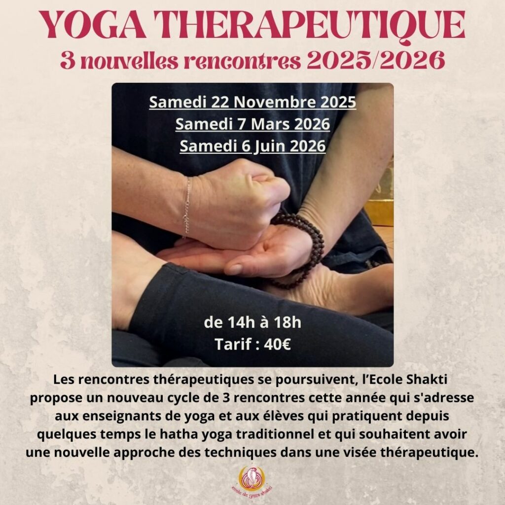 Ces rencontres thérapeutiques s’adressent aux élèves qui pratiquent depuis quelque temps le yoga traditionnel et qui souhaitent avoir une nouvelle approche des techniques avec une visée thérapeutique. Nous verrons des outils applicables dans votre quotidien dans une perspective préventive surtout mais également curative pour une meilleure santé et obtenir une homéostasie.